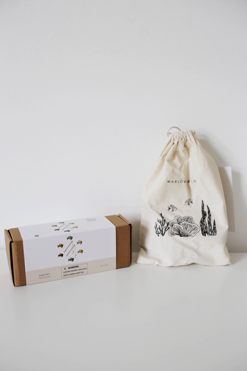Marlowe & Co's fishing playset will inspire new adventures during playtime! Our fishing set is made from high quality silicone and wood materials, making it durable and safe. This fishing toy set is not only adorable but it also helps to develop their fine motor skills, hand-eye coordination, and problem-solving skills. The fishing set includes two fishing rods, and six colorful silicone fish and a custom cotton storage bag to store the fishing set when not in use. This set is a perfect gift and is packaged in a cotton storage bag and a giftable box.