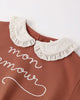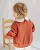 Our Collared Sweatshirt made from our french terry fabric. This sweatshirt has an embroidered ruffled collar, button closure on the back and a gathered sleeve and waist for a relaxed fit.