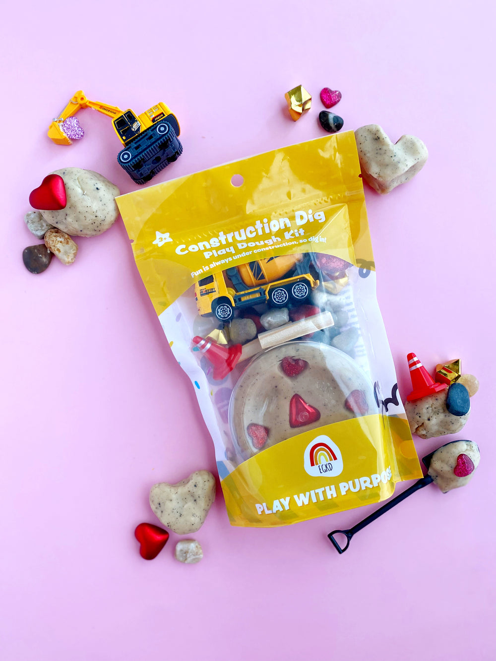 A fantastic grab and go Valentine's gift for kids, our sensory play kits offer a half pound of sensory dough and themed play pieces to create a fun interactive scene. Includes one half pound jar of Cookie Dough KidDough with hidden heart resin charms, construction vehicle, shovel, wood planks, silicone heart, gold acrylic gemstone, and natural stones.