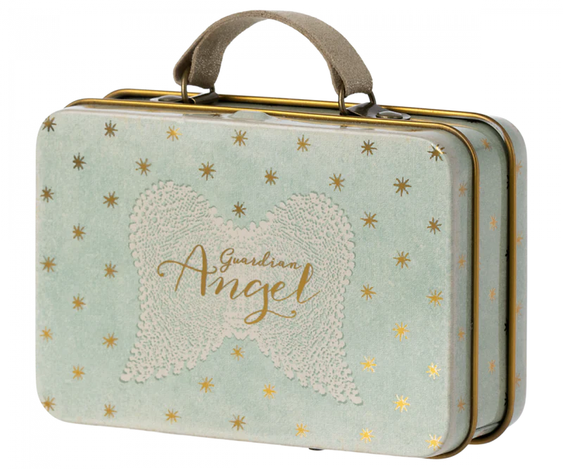 Guardian angels do their best to protect and watch over the little ones. This guardian angel comes in a mint-colored metal suitcase.