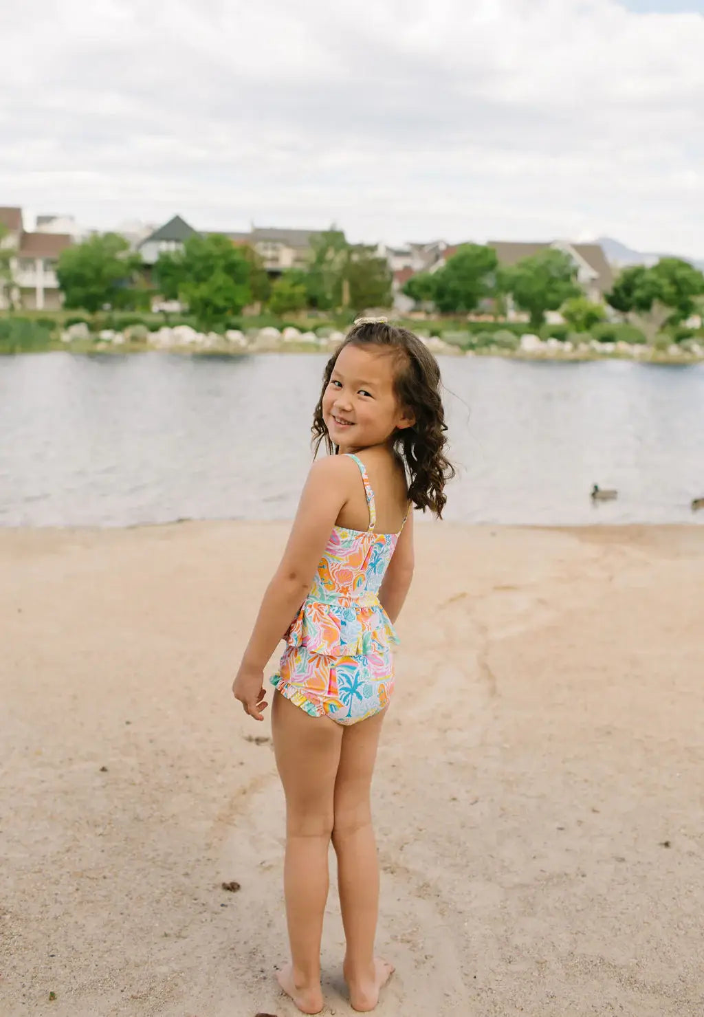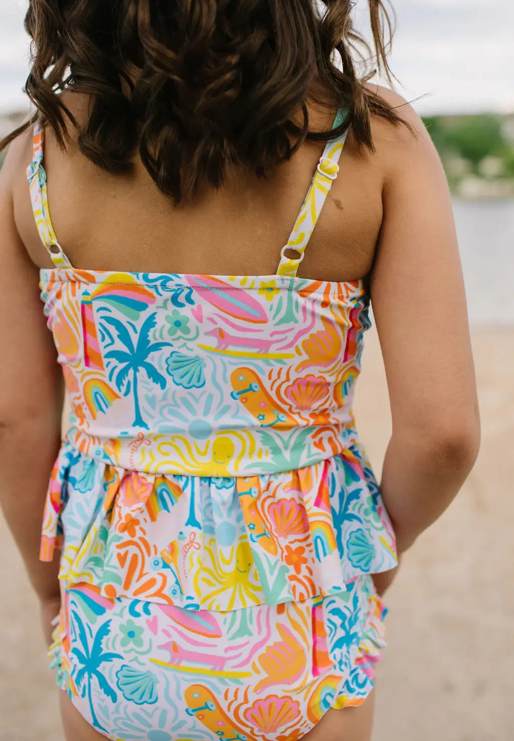 Make a splash this summer with the Emma Swim Set, featuring a wide-neck spaghetti strap tankini top with a charming peplum ruffle, paired with side-ruffled bikini bottoms for extra fun and flair. Crafted from UPF 50 protected fabric with a soft beige lining, this set offers both sun safety and adorable style in a lively summer print. Wide neck spaghetti straps with peplum ruffle top Bikini bottoms with playful side ruffles