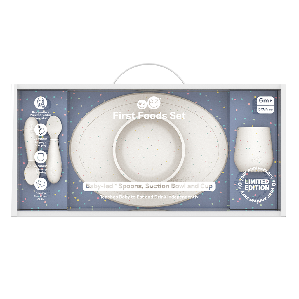 Most parents introduce solids / first foods to their baby at 4 to 6 months of age. This experience can be fun, but it also can be messy, stressful and overwhelming. With the First Foods Set ezpz provides all of the developmental tools you need to set baby up for mealtime milestones + success!