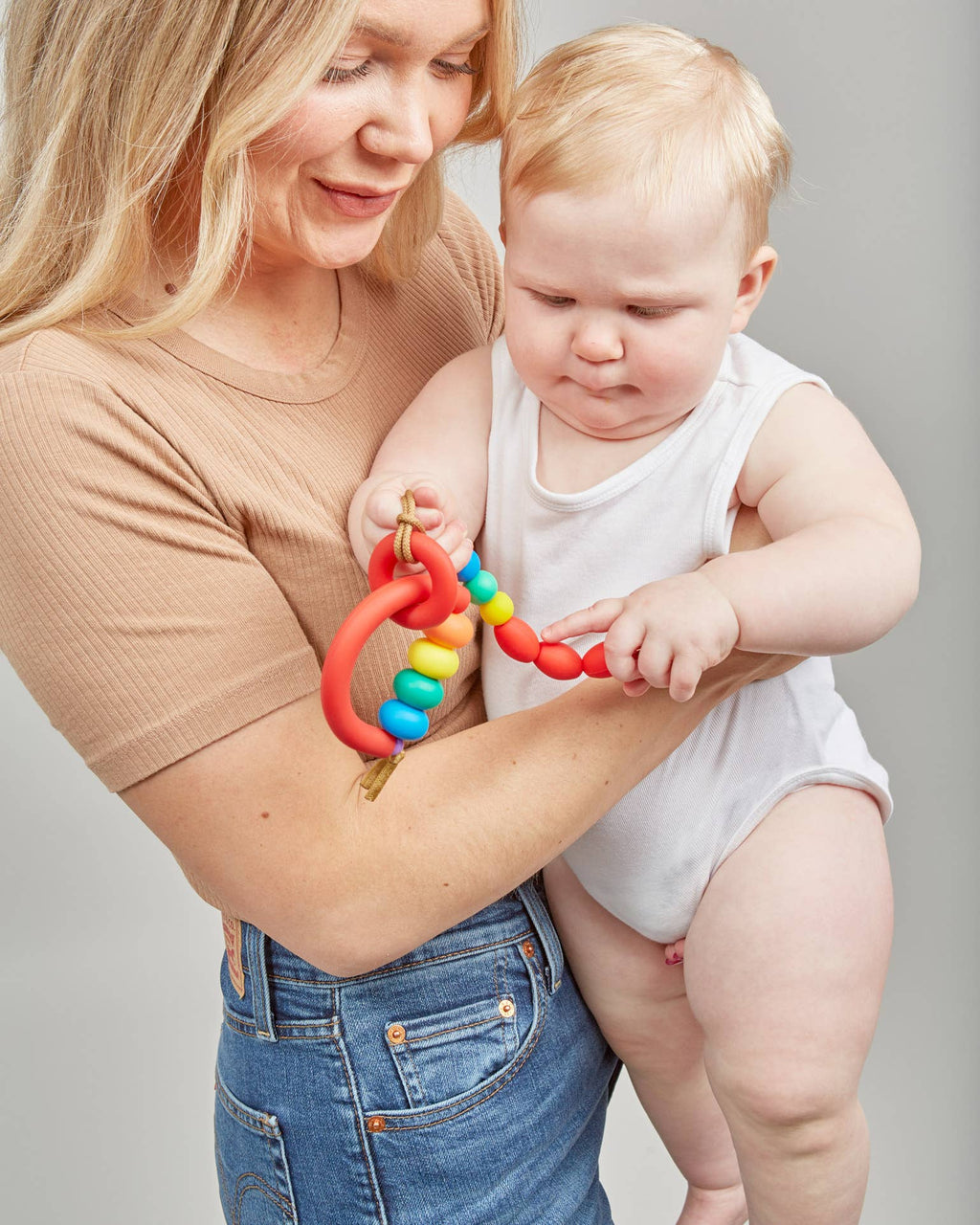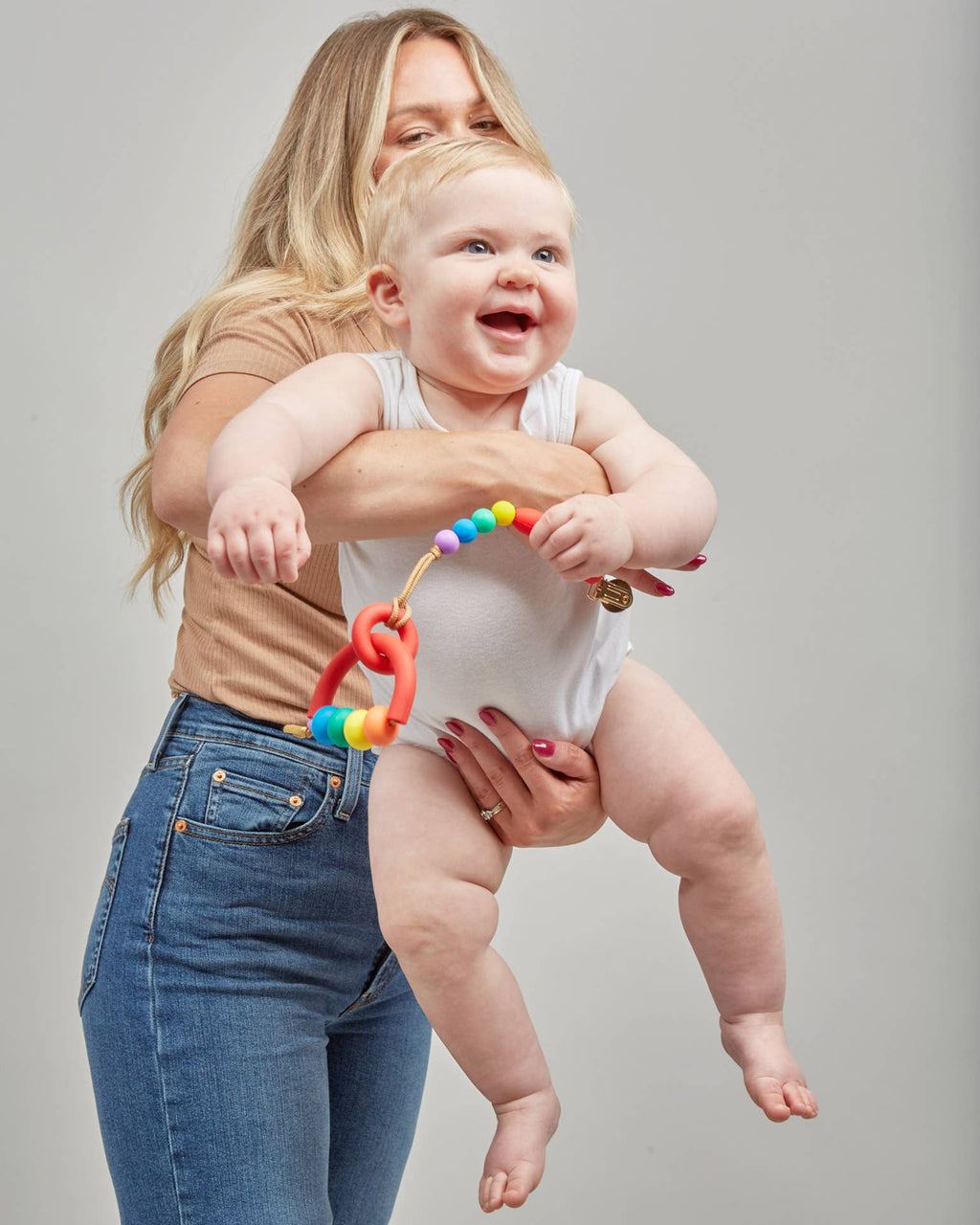 Inspired by the artful shapes that make up the world around us, the Arch Teether invites parent and child to stay curious, explore and engage. Featuring exuberant custom beads in brilliant colors and a playful ring, Arch builds a bridge between the every day to the extraordinary, enchanting parents, little ones, and art lovers of all kinds.