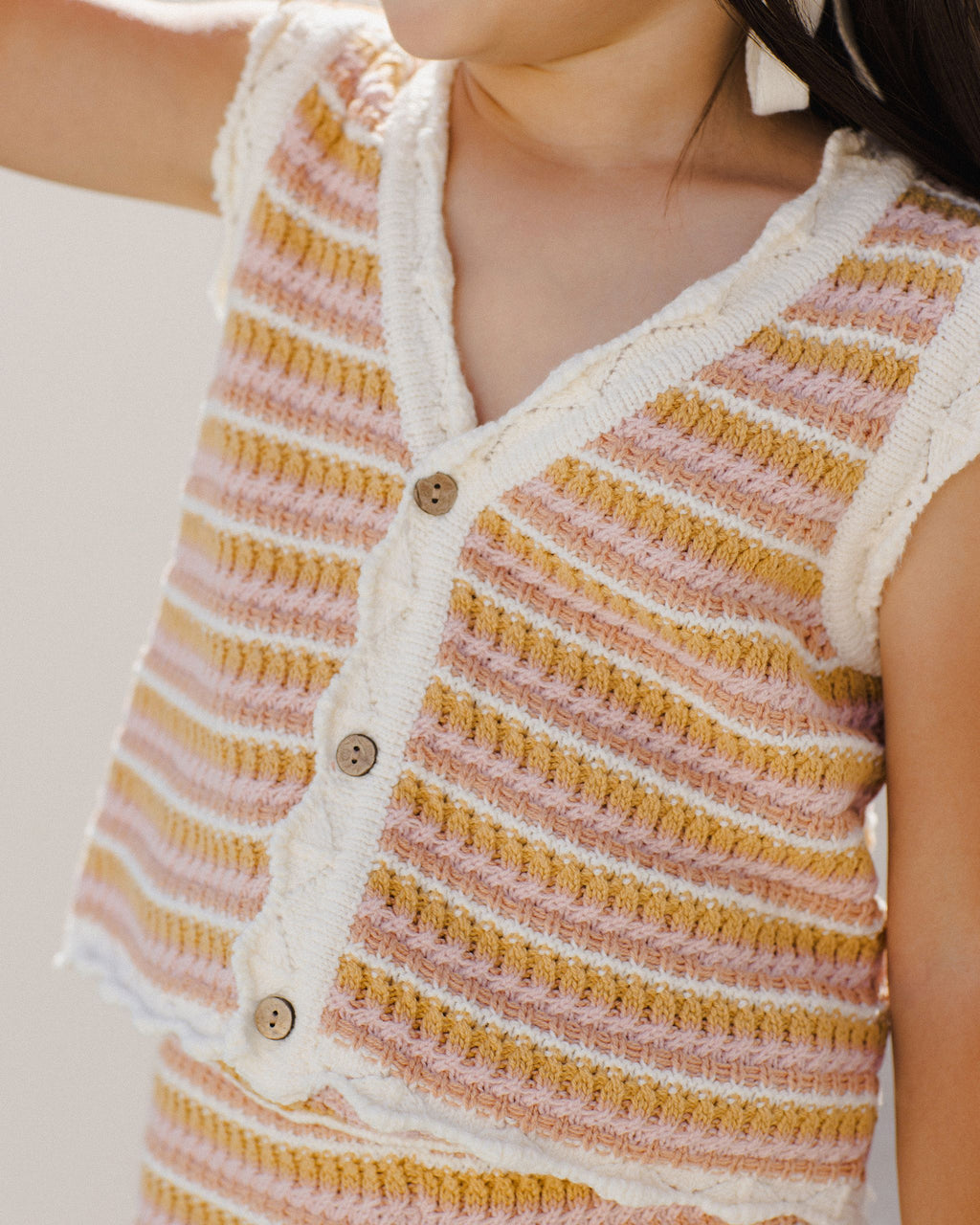 This set is your look for summer! Featuring coconut buttons down the front and crocheted scalloped trim.Featuring our ‘pink stripe’ pattern. Bring on the good times in this groovy crochet. Care: Hand wash only.Made of 60% cotton / 40% acrylic