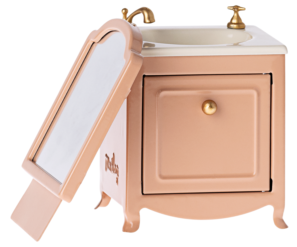 A beautiful item for the royal bathroom in the Maileg mouse castle. It has a small closet under the sink and of course a mirror as well. The mirror is removable for extra decorating options!