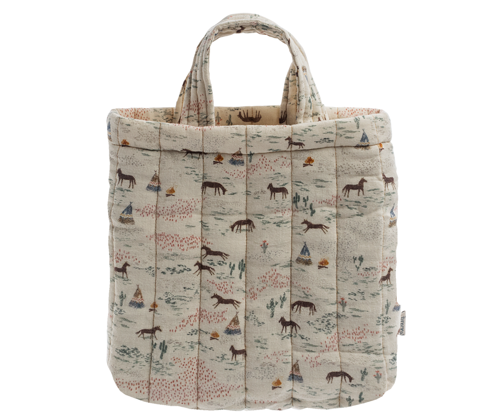 This updated design is a beautiful quilted tote bag for younger children. It's great for bringing a lunchbox to kindergarten or maybe some favorite toys. This padded bag has 2 handles and does not have a closure, for easy use.